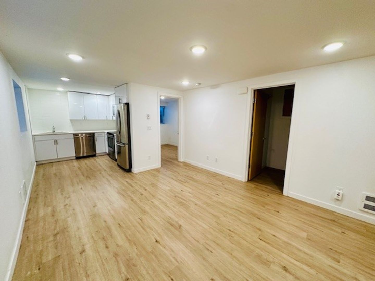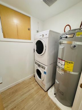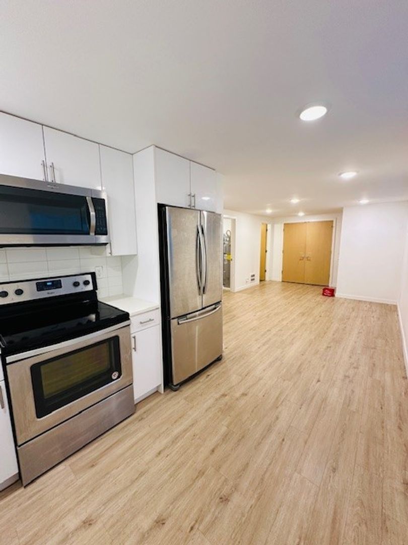 Available now! Basement unit in charming six-unit building available now. Bright kitchen with stainless appliances, stone counters, and fresh cabinetry. In unit stacked washer/dryer. Spacious living room open to kitchen. Bedroom has walk in closet. Darling bathroom with modern finishes, tub, and bright lighting. Leschi offers city convenience with a charming and relaxed atmosphere. Lake Washington and waterfront parks at your doorstep. Close to city center, UW, and eastside access. Rental rate includes water/sewer/garbage utilities. One dog under 25 lbs. okay with additional $50 monthly pet rent.