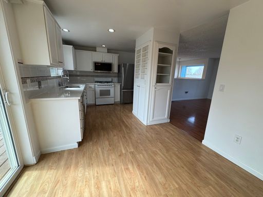 Available now! Well maintained home in Cul-de-Sac. Park like fully fenced backyard w/covered deck & patio + BBQ area. Nice flooring. Large living rm w/gas F/P & wood mantle. Kitchen w/eating space+custom china cabinets & quartz counters. Slider off kitchen to deck & patio. Primary bedroom has 3/4 bath and 2 bedrooms and full hall bath on main floor. Basement has family room w/wood stove, 4th bedroom, utility room w/full size W/D and half bath. Storage room & full size bedroom.2 car garage & addt parking, Avail. NOW. Pets under 40lbs c/c.