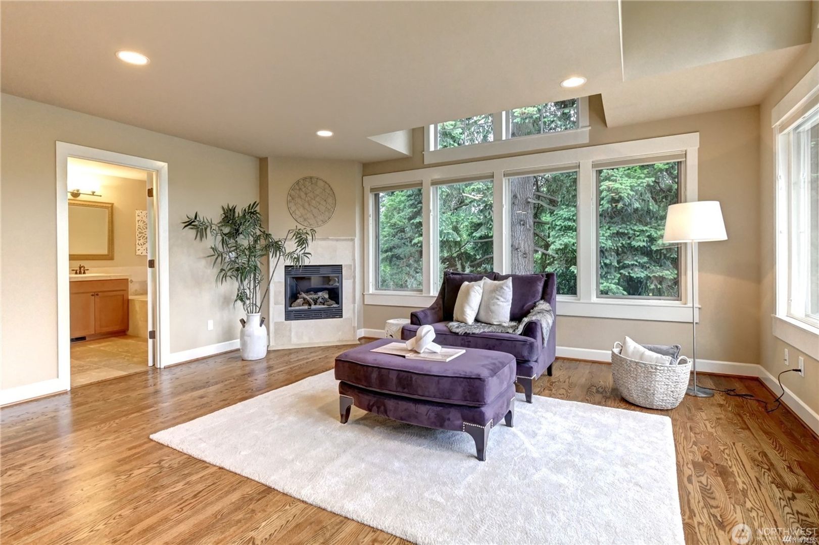 appliances. Partial lake view from grand primary suite, featuring sitting area with fireplace and spa bath with jetted tub