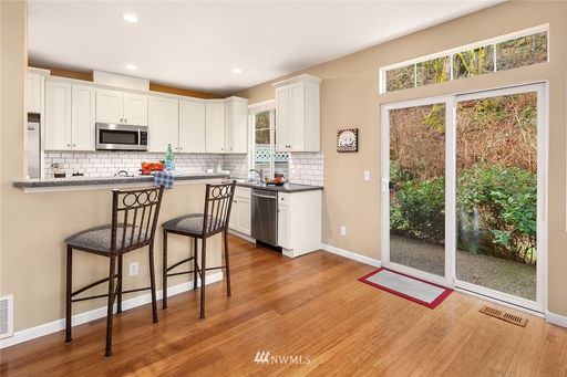 Available May 5th. Amazing corner unit townhome next to lush greenbelt at the top of Lakemount View. Many rooms have been repainted – modern color scheme. Updated kitchen on main level, hardwood floors, lovely living room with gas fireplace, dining room with glass slider to large rear patio. Upper level features three bedrooms and two full bathrooms. Lower level is a huge rec room. Full-sized washer/dryer. No maintenance yard – it is an extension of enormous greenbelt. 2-car garage. Visitor parking. Near I-90, numerous parks and trails, shopping areas. Award-winning Bellevue schools. Prefer No Pets; case-by-case (max of 2, under 40#).