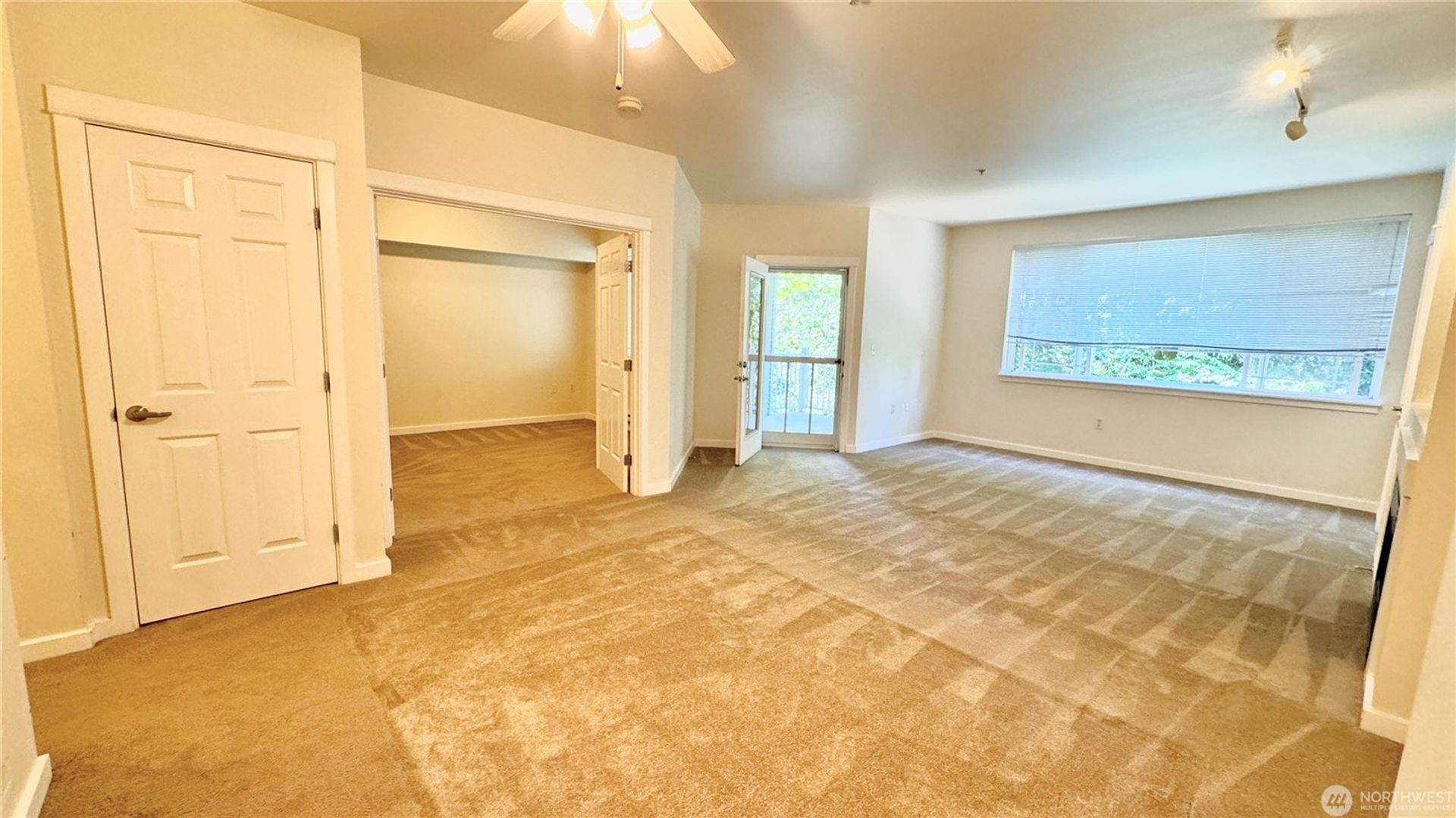 Available NOW! Light filled, open floorplan with 9 ft ceilings & new carpet. Living room with fireplace & dining area. Kitchen with newer SS appliances & breakfast bar. Large primary bedroom with 5 piece en-suite. Secondary bedroom with full bathroom in hallway for easy access. Pleasant territorial west view with oversized deck great for entertaining and views of Lake Boren in fall/winter. Washer/Dryer in unit. 1 reserved parking space in controlled community garage. controlled lobby entrance, elevator entrance, great community amenities: fitness room, hot tub in clubhouse & local park. Near Lake Boren Park, library, restaurants, retail shopping & bus station. Easy access to I-405/ I-90. No pets. W/S/garbage included in rent. $300 move in fee.