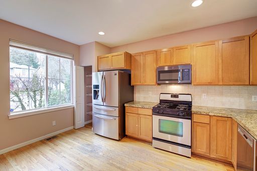 Available Now. Elegant 3-bedroom, 2.5-bath residence located in the sought-after Trails neighborhood of Redmond Ridge. This beautifully maintained home offers a chef-inspired kitchen with stainless steel appliances and granite counter tops, complemented by rich oak hardwood floors throughout the main level. The open-concept layout and expansive great room provide an ideal setting for both entertaining and comfortable daily living. Generous natural light fills the interiors, while the private backyard and patio back to a serene natural greenbelt, creating a peaceful retreat. Upstairs holds a large spacious primary bedroom with en-suite and walk in closet along with 2 additional bedrooms and a hall bath. A versatile loft upstairs adds flexible living space, perfect for a home office or lounge area. 2 Car garage w/ plenty of built in storage. Ready for move in now! Pets OK, 1 pet max w/ additional pet based rent.